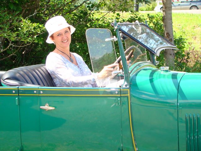 Dans une voiture d'époque et avec une robe d'époque, Hélène est prète pour une randonnée.